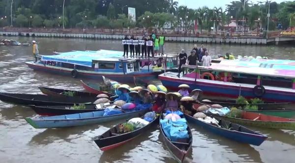 Formasi susunan jukung ditampilkan para pedagang pasar terapung dalam kampanye kreatif anti-rokok yang digelar di Sungai Martapura, Banjarmasin. (Foto: iNews/Deny M Yunus)